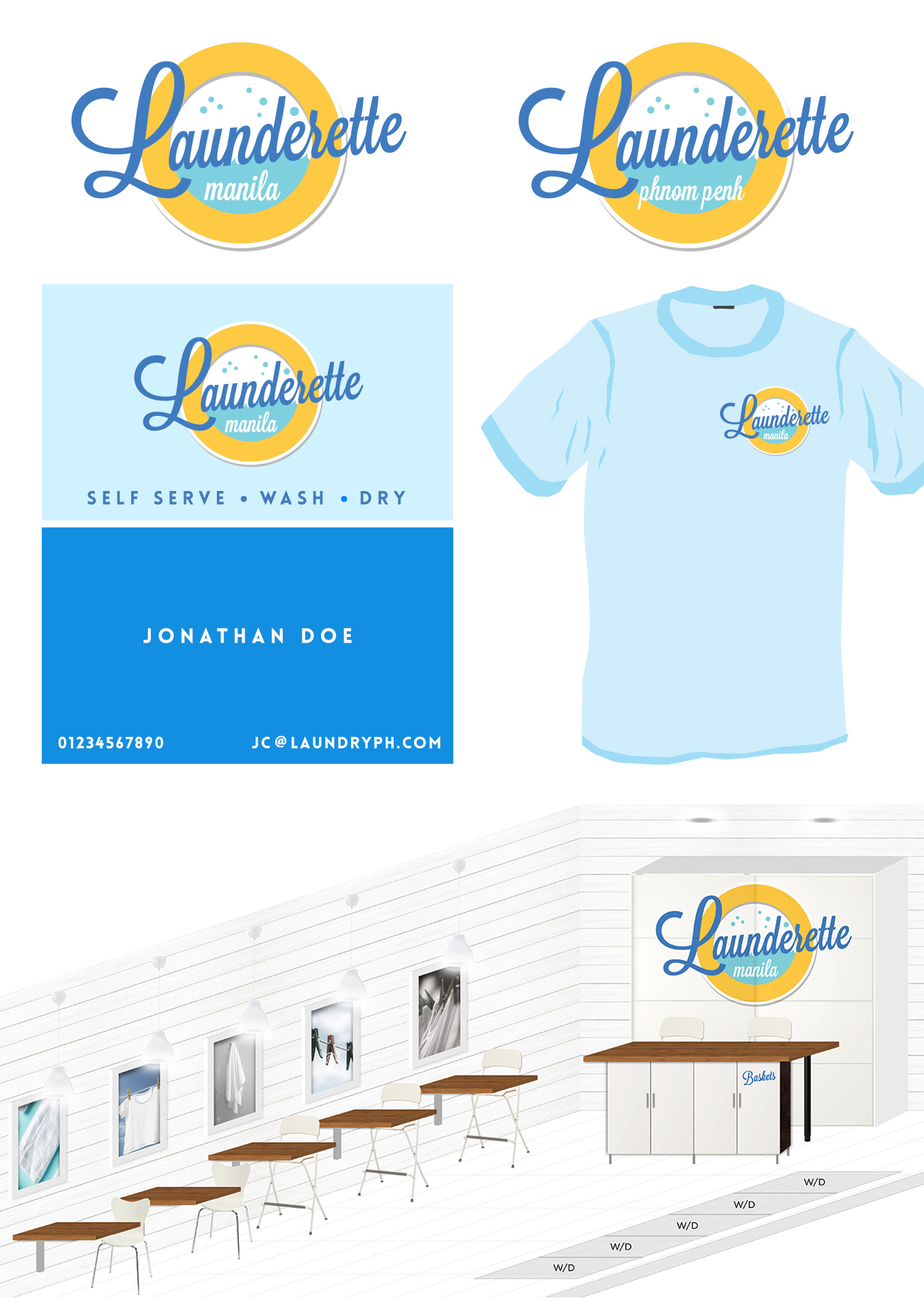 Brand design for a chain of laundromats. Logo and branding exploration, as well as store layout and design.