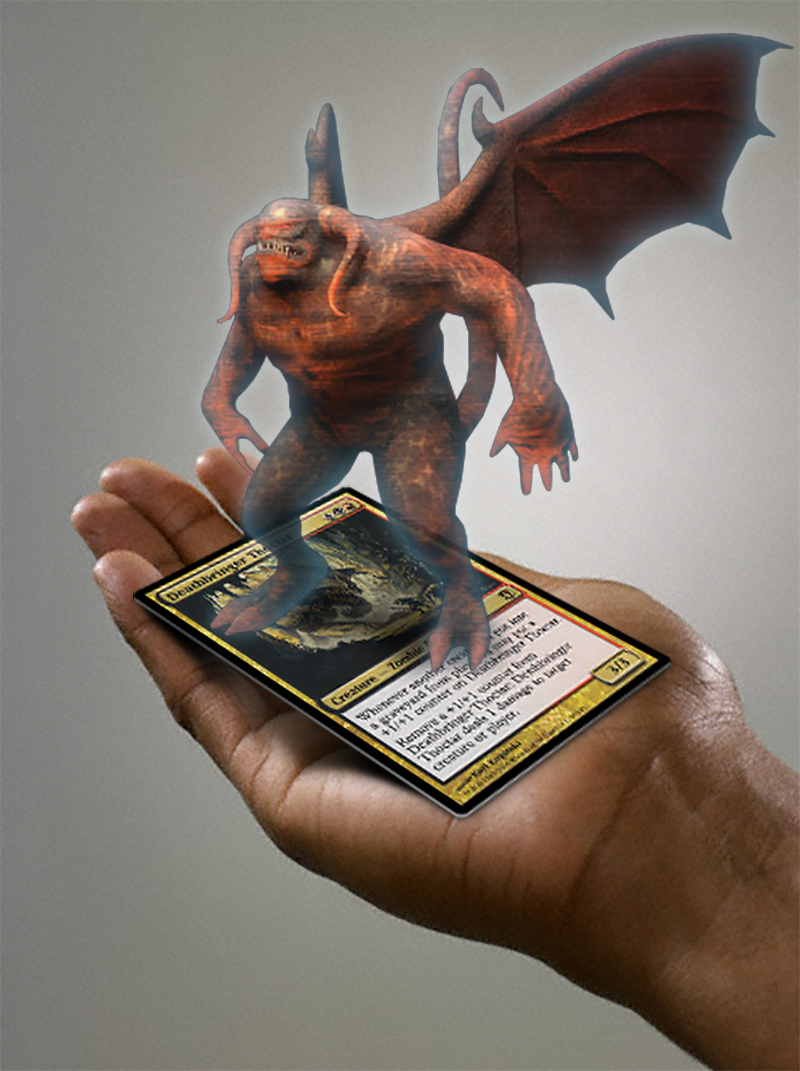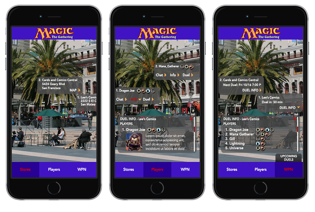 Using virtual reality, similar to Yelp's monocle, but the twist is the ability to find other players to challenge nearby. This expands the reach of the gamers beyond just card shops, friend circles.